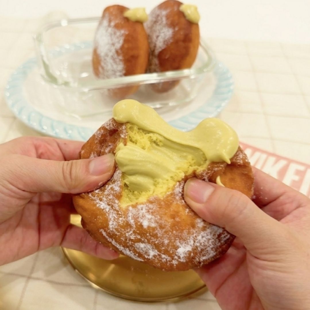 - 甜甜圈用筷子戳洞,擠入奶醬,完成!